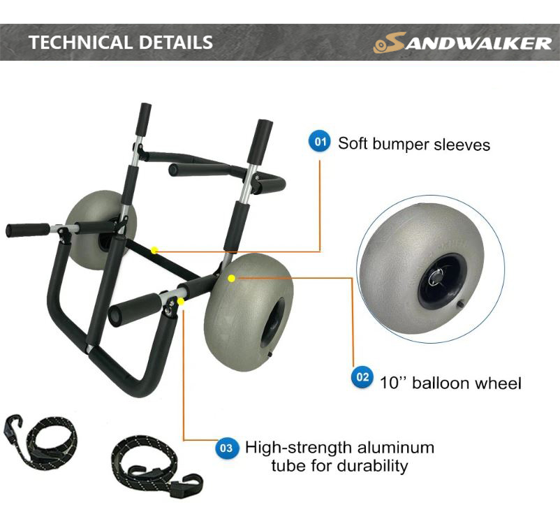 Эта тележка имеет прочную алюминиевую конструкцию, которая обеспечивает прочность и долговечность, гарантируя, что она сможет противостоять суровым элементам и местности, с которыми можно столкнуться во время транспортировки.